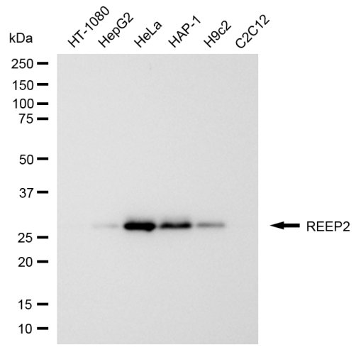 Western blotting analysis using REEP2 antibody. Total cell lysates (30 μg) from various cell lines were loaded and separated by SDS-PAGE. The blot was incubated with REEP2 antibody and HRP-conjugated goat anti-rabbit secondary antibody respectively.