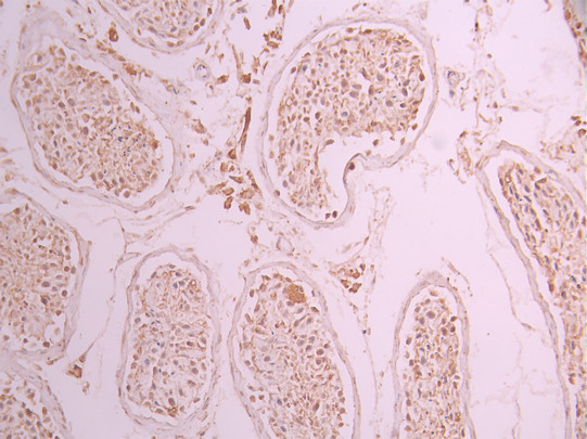• IHC image of CSB-RA264975A0HU diluted at 1:100 and staining in paraffin-embedded human testis tissue performed on a Leica BondTM system. After dewaxing and hydration, antigen retrieval was mediated by high pressure in a citrate buffer (pH 6.0). Section was blocked with 10% normal goat serum 30min at RT. Then primary antibody (1% BSA) was incubated at 4°C overnight. The primary is detected by a Goat anti-rabbit polymer IgG labeled by HRP and visualized using 0.05% DAB.