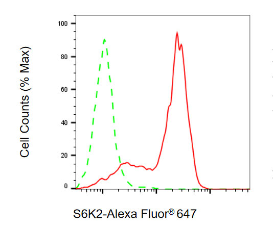 • Flow cytometric analysis of S6K2 expression in HAP-1 cells using S6K2 antibody. Green, isotype control; red, S6K2.