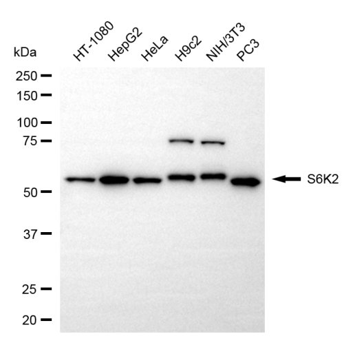 • Western blotting analysis using S6K2 antibody. Total cell lysates (30 μg) from various cell lines were loaded and separated by SDS-PAGE. The blot was incubated with S6K2 antibody and HRP-conjugated goat anti-rabbit secondary antibody respectively.