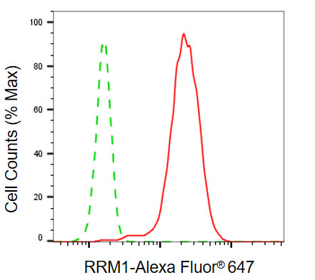 Flow cytometric analysis of RRM1 expression in HepG2 cells using RRM1 antibody. Green, isotype control; red, RRM1.