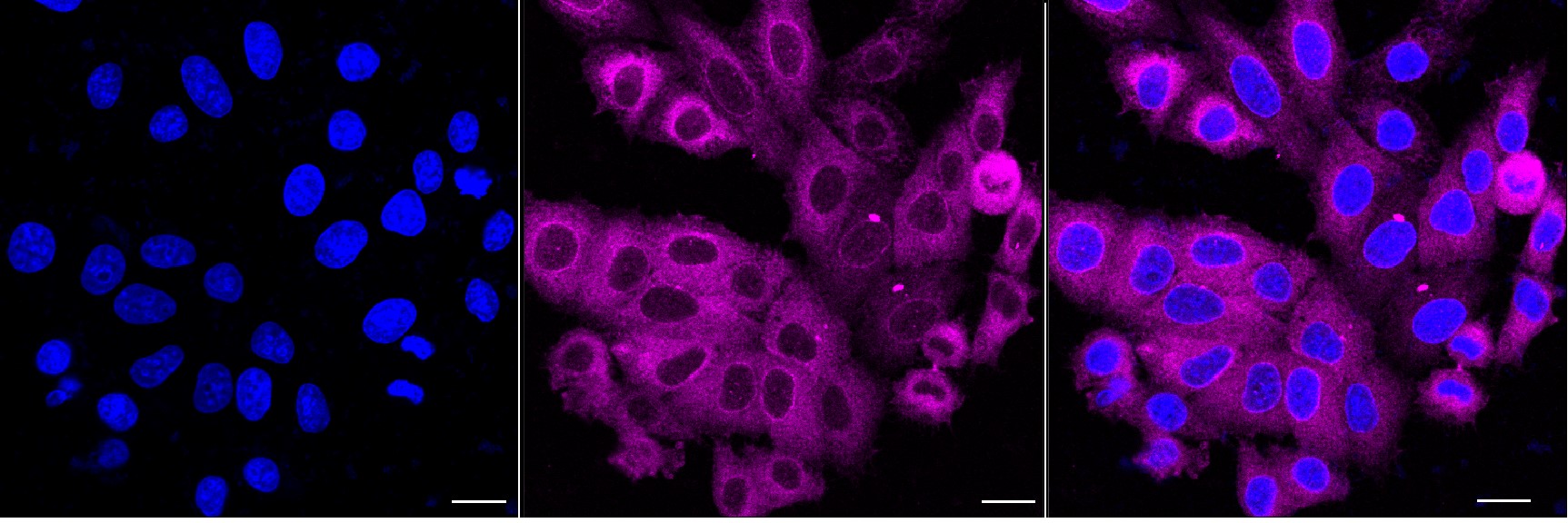 Immunocytochemical staining of HepG2 cells with RRM1 antibody. Nuclei were stained blue with DAPI; RRM1 was stained magenta with Alexa Fluor? 647. Images were taken using Leica stellaris 5. Protein abundance based on laser Intensity and smart gain: Medium. Scale bar, 20 μm.