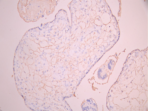 • IHC image of CSB-RA859932MA1HU diluted at 1:50 and staining in paraffin-embedded human placenta tissue performed on a Leica BondTM system. After dewaxing and hydration, antigen retrieval was mediated by high pressure in a citrate buffer (pH 6.0). Section was blocked with 10% normal goat serum 30min at RT. Then primary antibody (1% BSA) was incubated at 4°C overnight. The primary is detected by a Anti-Human lgG, Fcy Fragment Specific labeled by HRP and visualized using 0.05% DAB.