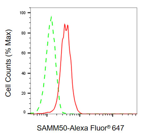 Flow cytometric analysis of SAMM50 expression in HeLa cells using SAMM50 antibody. Green, isotype control; red, SAMM50.