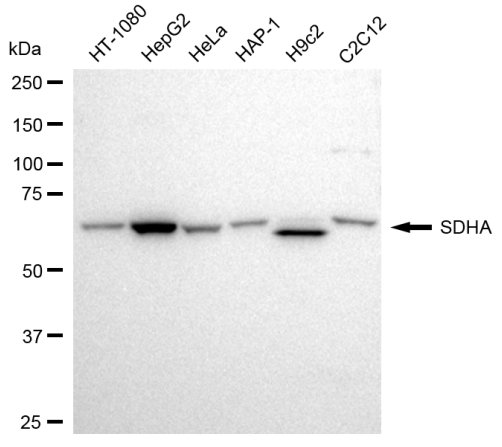 • Western blotting analysis using SDHA antibody. Total cell lysates (30 μg) from various cell lines were loaded and separated by SDS-PAGE. The blot was incubated with SDHA antibody and HRP-conjugated goat anti-rabbit secondary antibody respectively. SDHA, succinate dehydrogenase complex flavoprotein subunit A.