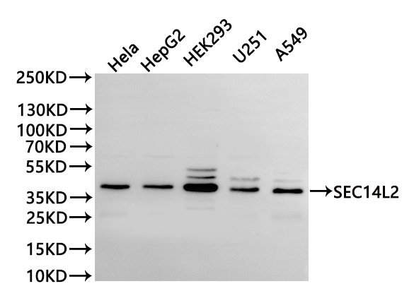 All lanes: SEC14L2 antibody at 1:1000
