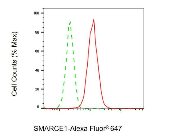 Flow cytometric analysis of SMARCE1 expression in HAP-1 cells using SMARCE1 antibody. Green, isotype control; red, SMARCE1.