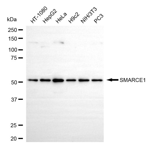 Western blotting analysis using SMARCE1 antibody. Total cell lysates (30 μg) from various cell lines were loaded and separated by SDS-PAGE. The blot was incubated with SMARCE1 antibody and HRP-conjugated goat anti-rabbit secondary antibody respectively.