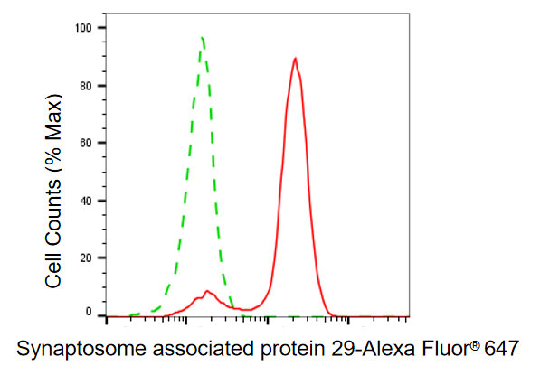 Flow cytometric analysis of synaptosome associated protein 29 expression in HepG2 cells using synaptosome associated protein 29 antibody. Green, isotype control; red, synaptosome associated protein 29.