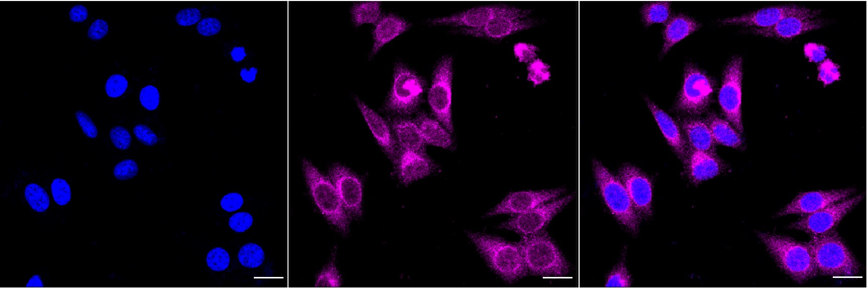 Immunocytochemical staining of HepG2 cells with Synaptosome associated protein 29 antibody. Nuclei were stained blue with DAPI; Synaptosome associated protein 29 was stained magenta with Alexa Fluor? 647. Images were taken using Leica stellaris 5. Protein abundance based on laser Intensity and smart gain: Medium. Scale bar, 20 μm.