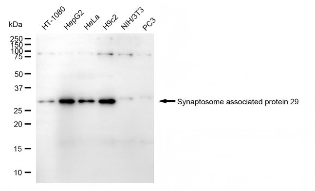 Western blotting analysis using synaptosome associated protein 29 antibody. Total cell lysates (30 μg) from various cell lines were loaded and separated by SDS-PAGE. The blot was incubated with synaptosome associated protein 29 antibody and HRP-conjugated goat anti-rabbit secondary antibody respectively.