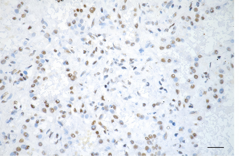 Immunohistochemistry was performed on paraffin-embedded human lung adenocarcinoma using SNRPA1 antibody. Antigen retrieval was done in sodium citrate buffer (pH 6.0). DAB was used for detection, with hematoxylin counterstaining. Images were acquired using a Nikon Ci-L Plus microscope (40× objective). Scale bar: 25 μm.