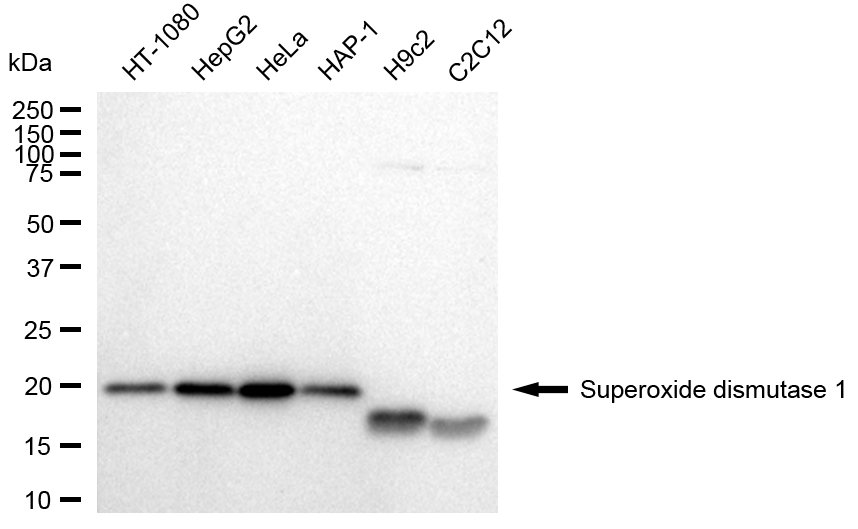 Western blotting analysis using Superoxide dismutase 1 antibody. Total cell lysates (30 μg) from various cell lines were loaded and separated by SDS-PAGE. The blot was incubated with Superoxide dismutase 1 antibody and HRP-conjugated goat anti-rabbit secondary antibody respectively.