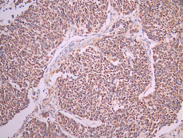 IHC image of CSB-RA449123A0HU diluted at 1:100 and staining in paraffin-embedded human lung cancer performed on a Leica BondTM system. After dewaxing and hydration, antigen retrieval was mediated by high pressure in a citrate buffer (pH 6.0). Section was blocked with 10% normal goat serum 30min at RT. Then primary antibody (1% BSA) was incubated at 4°C overnight. The primary is detected by a Goat anti-rabbit polymer IgG labeled by HRP and visualized using 0.05% DAB.