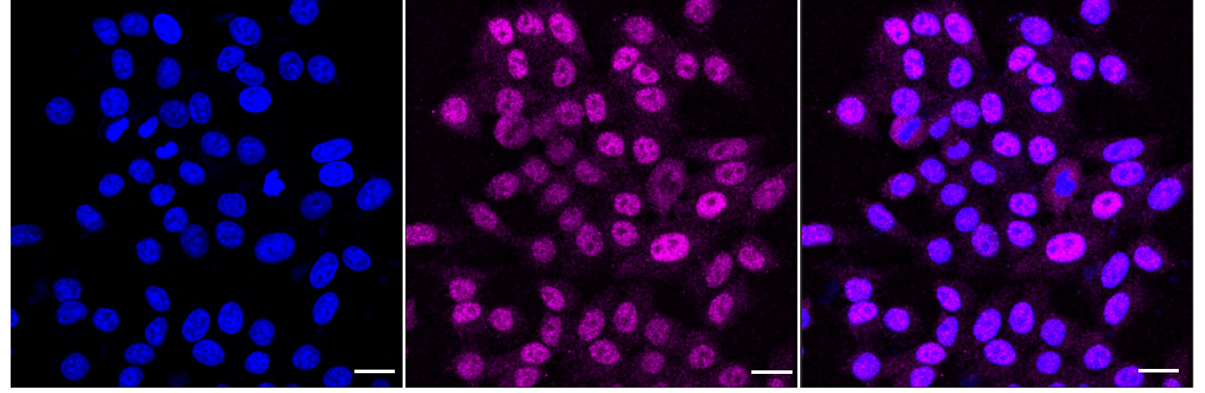 Immunocytochemical staining of HepG2 cells with SOX10 antibody. Nuclei were stained blue with DAPI; SOX10 was stained magenta with Alexa Fluor? 647. Images were taken using Leica stellaris 5. Protein abundance based on laser Intensity and smart gain: Medium. Scale bar: 20 μm.