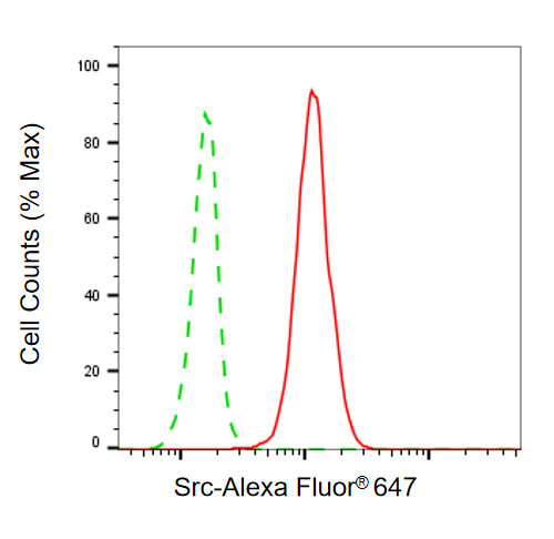 Flow cytometric analysis of Src expression in C2C12 cells using Src antibody. Green, isotype control; red, Src.