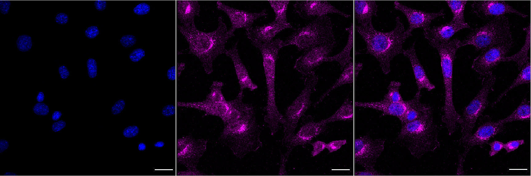 Immunocytochemical staining of HeLa cells with Src antibody. Nuclei were stained blue with DAPI; Src was stained magenta with Alexa Fluor? 647. Images were taken using Leica stellaris 5. Protein abundance based on laser Intensity and smart gain: Medium. Scale bar, 20 μm.