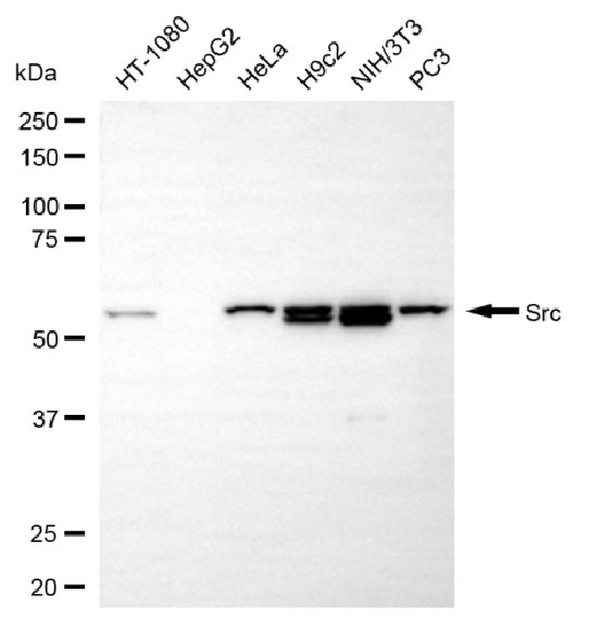 Western blotting analysis using src antibody. Total cell lysates (30 μg) from various cell lines were loaded and separated by SDS-PAGE. The blot was incubated with src antibody and HRP-conjugated goat anti-rabbit secondary antibody respectively.