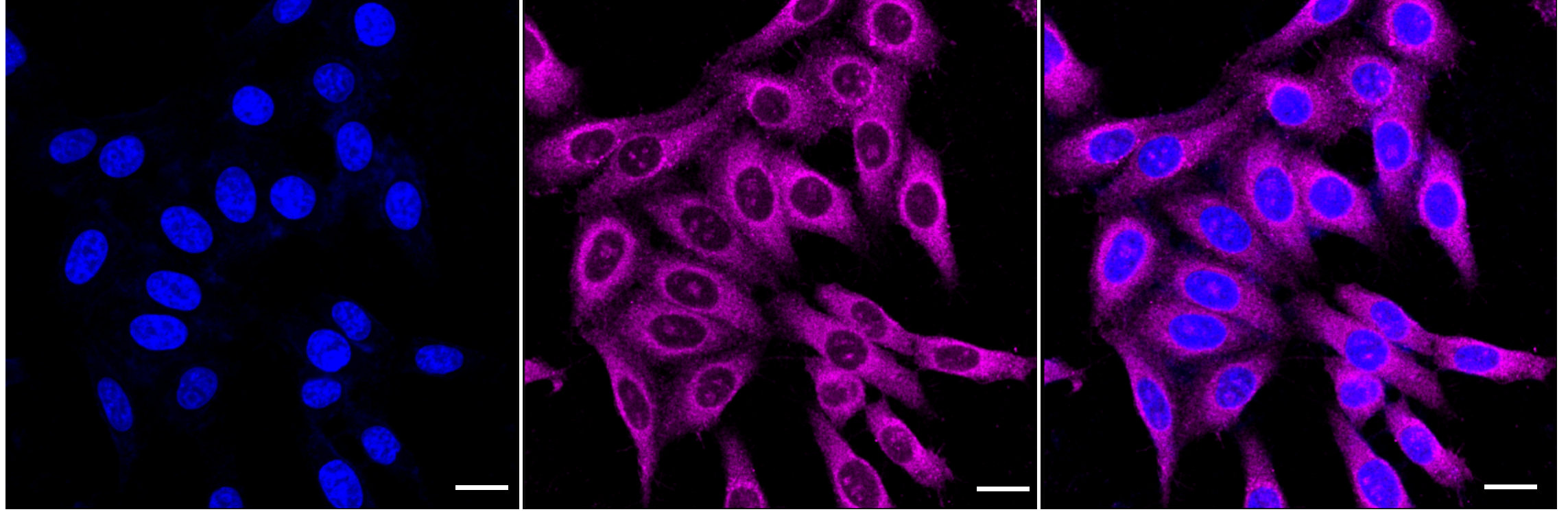 Immunocytochemical staining of HepG2 cells with STK39 antibody. Nuclei were stained blue with DAPI; STK39 was stained magenta with Alexa Fluor? 647. Images were taken using Leica stellaris 5. Protein abundance based on laser Intensity and smart gain: High. Scale bar: 20 μm.