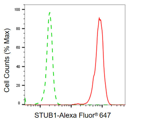 Flow cytometric analysis of STUB1 expression in C2C12 cells using STUB1 antibody. Green, isotype control; red, STUB1.