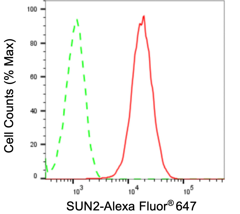 Flow cytometric analysis of SUN2 expression in C2C12 cells using SUN2 antibody. Green, isotype control; red, SUN2.