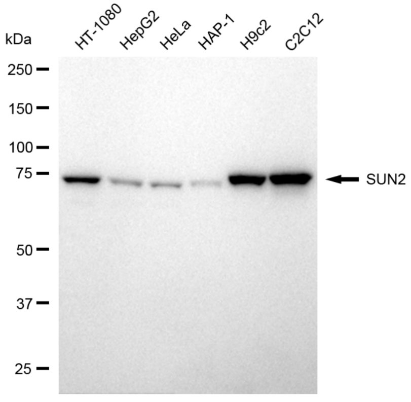 Western blotting analysis using SUN2 antibody. Total cell lysates (30 μg) from various cell lines were loaded and separated by SDS-PAGE. The blot was incubated with SUN2 antibody and HRP-conjugated goat anti-rabbit secondary antibody respectively.