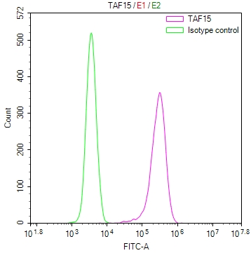 • Overlay Peak curve showing jurkat cells stained with CSB-RA899164A0HU (red line) at 1:100. The cells were fixed in 4% formaldehyde and permeated by 0.2% TritonX-100 for 10min. Then 10% normal goat serum to block non-specific protein-protein interactions followed by the antibody (1ug/1*106cells) for 45min at 4℃. The secondary antibody used was FITC-conjugated goat anti-rabbit IgG (H+L) at 1/200 dilution for 35min at 4℃.Control antibody (green line) was Rabbit IgG (1ug/1*106cells) used under the same conditions. Acquisition of >10,000 events was performed.