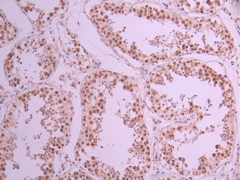 • IHC image of CSB-RA899164A0HU diluted at 1:100 and staining in paraffin-embedded human testis tissue performed on a Leica BondTM system. After dewaxing and hydration, antigen retrieval was mediated by high pressure in a citrate buffer (pH 6.0). Section was blocked with 10% normal goat serum 30min at RT. Then primary antibody (1% BSA) was incubated at 4°C overnight. The primary is detected by a Goat anti-rabbit polymer IgG labeled by HRP and visualized using 0.05% DAB.