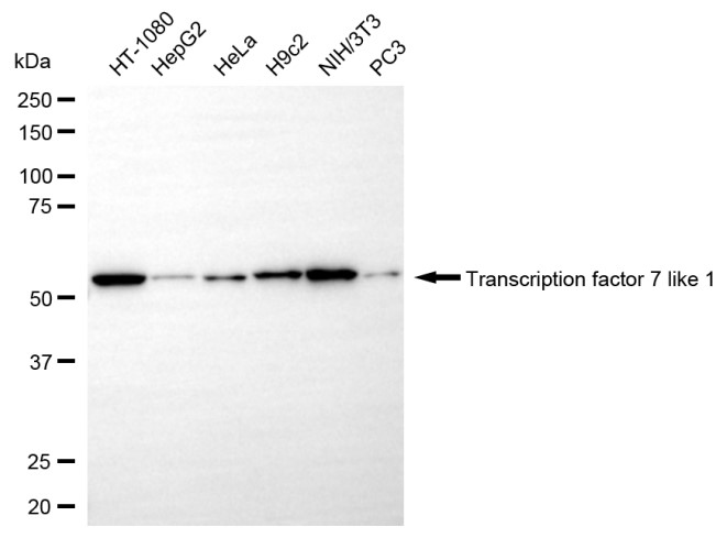 Western blotting analysis using transcription factor 7 like 1 antibody. Total cell lysates (30 μg) from various cell lines were loaded and separated by SDS-PAGE. The blot was incubated with transcription factor 7 like 1 antibody and HRP-conjugated goat anti-rabbit secondary antibody respectively.