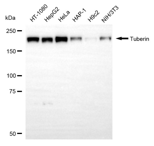 Western blotting analysis using tuberin antibody. Total cell lysates (30 μg) from various cell lines were loaded and separated by SDS-PAGE. The blot was incubated with tuberin antibody and HRP-conjugated goat anti-rabbit secondary antibody respectively.