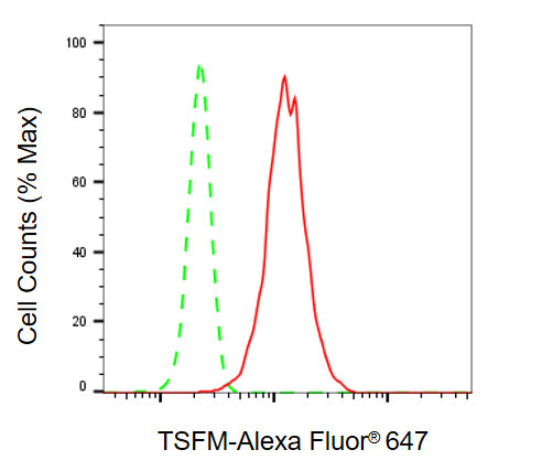 Flow cytometric analysis of TSFM expression in HeLa cells using TSFM antibody. Green, isotype control; red, TSFM.