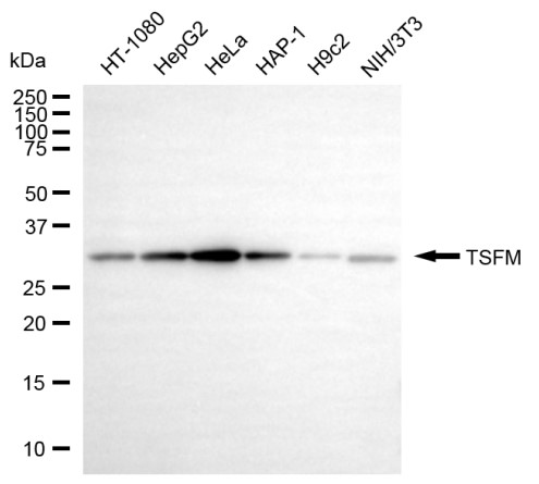 Western blotting analysis using TSFM antibody. Total cell lysates (30 μg) from various cell lines were loaded and separated by SDS-PAGE. The blot was incubated with TSFM antibody and HRP-conjugated goat anti-rabbit secondary antibody respectively.