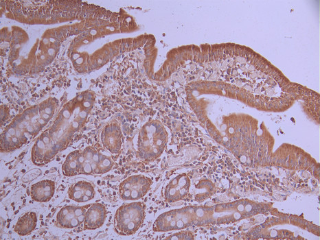 IHC image of CSB-RA786302A0HU diluted at 1:100 and staining in paraffin-embedded human small intestine tissue performed on a Leica BondTM system. After dewaxing and hydration, antigen retrieval was mediated by high pressure in a citrate buffer (pH 6.0). Section was blocked with 10% normal goat serum 30min at RT. Then primary antibody (1% BSA) was incubated at 4°C overnight. The primary is detected by a Goat anti-rabbit polymer IgG labeled by HRP and visualized using 0.05% DAB.