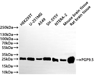 Positive WB detected in: HEK293T whole cell lysate(20μg), U-251MG whole cell lysate(20μg),A549 whole cell lysate(20μg),SH-SY5Y whole cell lysate(20μg),NTERA-2 whole cell lysate(20μg), Mouse brain tissue lysate(20μg), Rat brain tissue lysate(20μg)