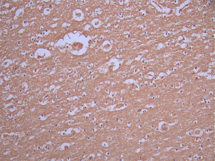 IHC image of CSB-RA928839A0HU diluted at 1:100 and staining in paraffin-embedded human brain tissue performed on a Leica BondTM system. After dewaxing and hydration, antigen retrieval was mediated by high pressure in a citrate buffer (pH 6.0). Section was blocked with 10% normal goat serum 30min at RT. Then primary antibody (1% BSA) was incubated at 4°C overnight. The primary is detected by a Goat anti-rabbit polymer IgG labeled by HRP and visualized using 0.05% DAB.