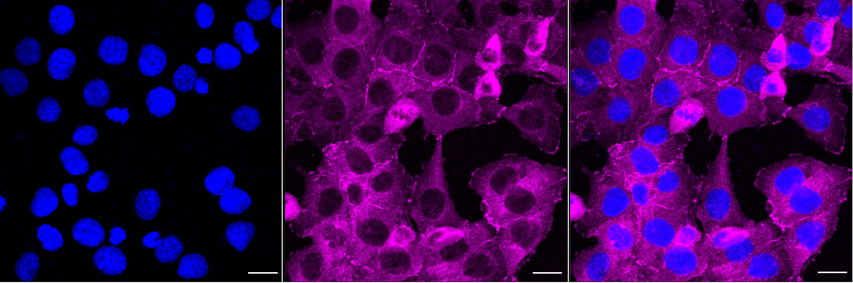 Immunocytochemical staining of HT-1080 cells with Vinculin antibody. Nuclei were stained blue with DAPI; Vinculin was stained magenta with Alexa Fluor? 647. Images were taken using Leica stellaris 5. Protein abundance based on laser Intensity and smart gain: High. Scale bar, 20 μm.