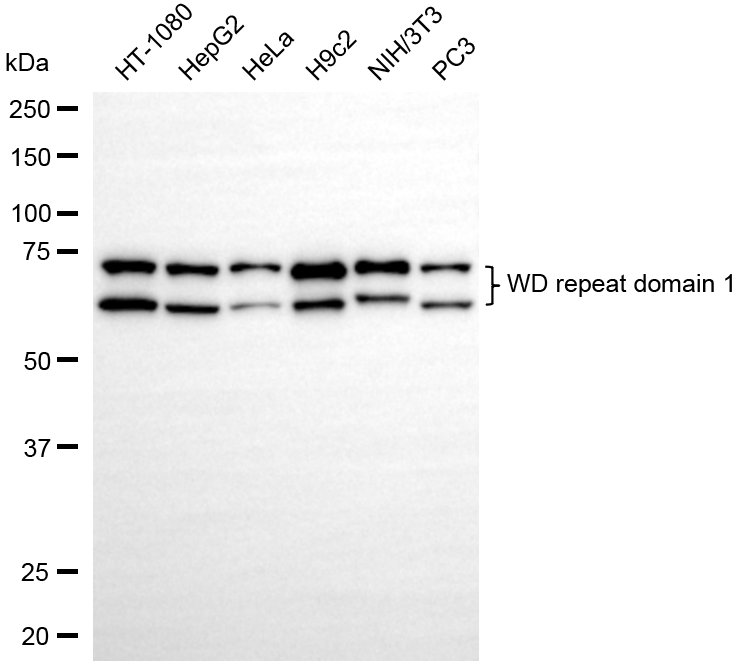 Western blotting analysis using WD repeat domain 1 antibody. Total cell lysates (30 μg) from various cell lines were loaded and separated by SDS-PAGE. The blot was incubated with WD repeat domain 1 antibody and HRP-conjugated goat anti-rabbit secondary antibody respectively.