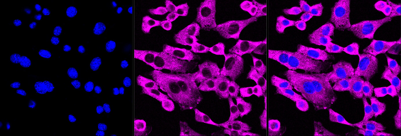 • Immunocytochemical staining of C2C12 cells with Phospho-eIF4B (S406) antibody. Nuclei were stained blue with DAPI; Phospho-eIF4B (S406) was stained magenta with Alexa Fluor? 647. Images were taken using Leica stellaris 5. Protein abundance based on laser Intensity and smart gain: Medium. Scale bar, 20 μm.