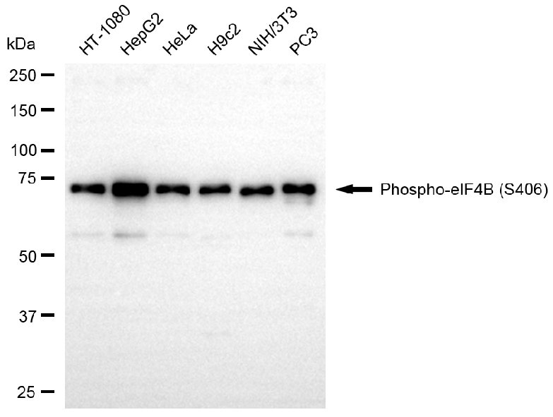 • Western blotting analysis using phospho-eIF4B (S406) antibody. Total cell lysates (20 μg) from various cell lines were loaded and separated by SDS-PAGE. The blot was incubated with phospho-eIF4B (S406) antibody and HRP-conjugated goat anti-rabbit secondary antibody respectively.
