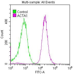 Overlay histogram showing Hela cells stained with CSB-RA001205A0HU (red line) at 1:50. The cells were fixed with 70% Ethylalcohol (18h) and then permeabilized with 0.3% Triton X-100 for 2 min. The cells were then incubated in 1x PBS /10% normal goat serum to block non-specific protein-protein interactions followed by primary antibody for 1 h at 4℃. The secondary antibody used was FITC goat anti-rabbit IgG (H+L) at 1/200 dilution for 1 h at 4℃. Control antibody (green line) was used under the same conditions. Acquisition of >10,000 events was performed.