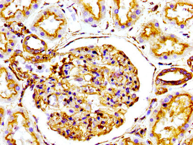 IHC image of CSB-RA001205A0HU diluted at 1:100 and staining in paraffin-embedded human kidney tissue performed on a Leica BondTM system. After dewaxing and hydration, antigen retrieval was mediated by high pressure in a citrate buffer (pH 6.0). Section was blocked with 10% normal goat serum 30min at RT. Then primary antibody (1% BSA) was incubated at 4℃ overnight. The primary is detected by a biotinylated secondary antibody and visualized using an HRP conjugated SP system.