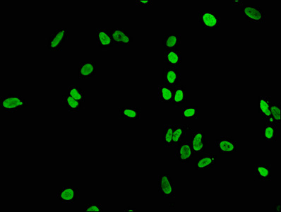 Immunofluorescence staining of Hela cells(treated by 15mM sodium butyrate for 30min) with CSB-RA010429A05acHU at 1:65,counter-stained with DAPI. The cells were fixed in 4% formaldehyde, permeabilized using 0.2% Triton X-100 and blocked in 10% normal Goat Serum. The cells were then incubated with the antibody overnight at 4℃.The secondary antibody was Alexa Fluor 488-congugated AffiniPure Goat Anti-Rabbit IgG (H+L).