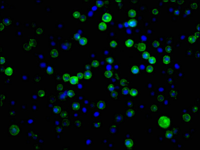 • Immunofluorescence staining of Raji cells with CSB-RA005934A0HU at 1:34,counter-stained with DAPI. The cells were fixed in 4% formaldehyde, permeabilized using 0.2% Triton X-100 and blocked in 10% normal Goat Serum. The cells were then incubated with the antibody overnight at 4℃.The secondary antibody was Alexa Fluor 488-congugated AffiniPure Goat Anti-Rabbit IgG (H+L).