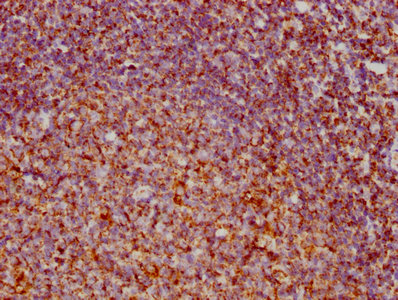 IHC image of CSB-RA213310A0HU diluted at 1:100 and staining in paraffin-embedded human lymph node tissue performed on a Leica BondTM system. After dewaxing and hydration, antigen retrieval was mediated by high pressure in a citrate buffer (pH 6.0). Section was blocked with 10% normal goat serum 30min at RT. Then primary antibody (1% BSA) was incubated at 4℃ overnight. The primary is detected by a Goat anti-rabbit IgG polymer labeled by HRP and visualized using 0.05% DAB.
