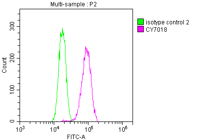 Overlay histogram showing Hela cells stained with CSB-RA877222A0HU (red line) at 1:50. The cells were fixed with 70% Ethylalcohol (18h) and then incubated in 10% normal goat serum to block non-specific protein-protein interactions followedby the antibody (1μg/1*106 cells) for 1 h at 4℃.The secondary antibody used was FITC-conjugated goat anti-rabbit IgG (H+L) at 1/200 dilution for 30min at 4℃. Control antibody (green line) was Rabbit IgG (1μg/1*106 cells) used under the same conditions. Acquisition of >10,000 events was performed.