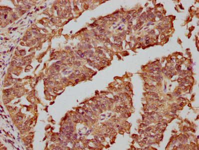 IHC image of CSB-RA008790A0HU diluted at 1:81 and staining in paraffin-embedded human cervical cancer performed on a Leica BondTM system. After dewaxing and hydration, antigen retrieval was mediated by high pressure in a citrate buffer (pH 6.0). Section was blocked with 10% normal goat serum 30min at RT. Then primary antibody (1% BSA) was incubated at 4℃ overnight. The primary is detected by a biotinylated secondary antibody and visualized using an HRP conjugated SP system.