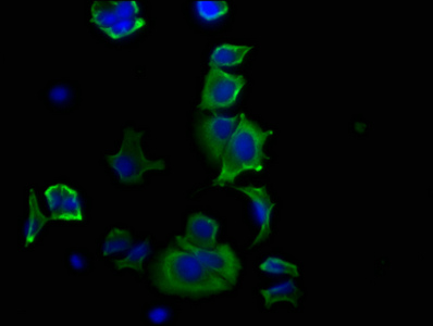 • Immunofluorescence staining of MCF-7 cells with CSB-RA010833A0HU at 1:20, counter-stained with DAPI. The cells were fixed in 4% formaldehyde, permeabilized using 0.2% Triton X-100 and blocked in 10% normal Goat Serum. The cells were then incubated with the antibody overnight at 4℃. The secondary antibody was Alexa Fluor 488-congugated AffiniPure Goat Anti-Rabbit IgG (H+L).