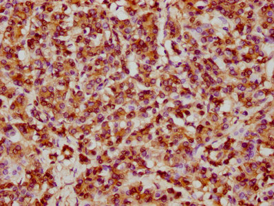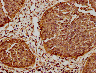 • IHC image of CSB-RA010833A0HU diluted at 1:61.9 and staining in paraffin-embedded human cervical cancer performed on a Leica BondTM system. After dewaxing and hydration, antigen retrieval was mediated by high pressure in a citrate buffer (pH 6.0). Section was blocked with 10% normal goat serum 30min at RT. Then primary antibody (1% BSA) was incubated at 4℃ overnight. The primary is detected by a biotinylated secondary antibody and visualized using an HRP conjugated SP system.