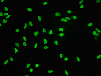 Immunofluorescence staining of Hela cells with CSB-RA010109A0HU at 1:60,counter-stained with DAPI. The cells were fixed in 4% formaldehyde, permeabilized using 0.2% Triton X-100 and blocked in 10% normal Goat Serum. The cells were then incubated with the antibody overnight at 4℃.The secondary antibody was Alexa Fluor 488-congugated AffiniPure Goat Anti-Rabbit IgG (H+L).