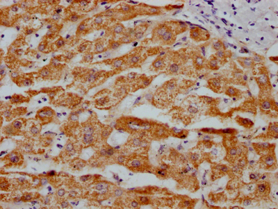 IHC image of CSB-RA250615A0HU diluted at 1:100 and staining in paraffin-embedded human liver tissue performed on a Leica BondTM system. After dewaxing and hydration, antigen retrieval was mediated by high pressure in a citrate buffer (pH 6.0). Section was blocked with 10% normal goat serum 30min at RT. Then primary antibody (1% BSA) was incubated at 4℃ overnight. The primary is detected by a Goat anti-rabbit IgG polymer labeled by HRP and visualized using 0.05% DAB.